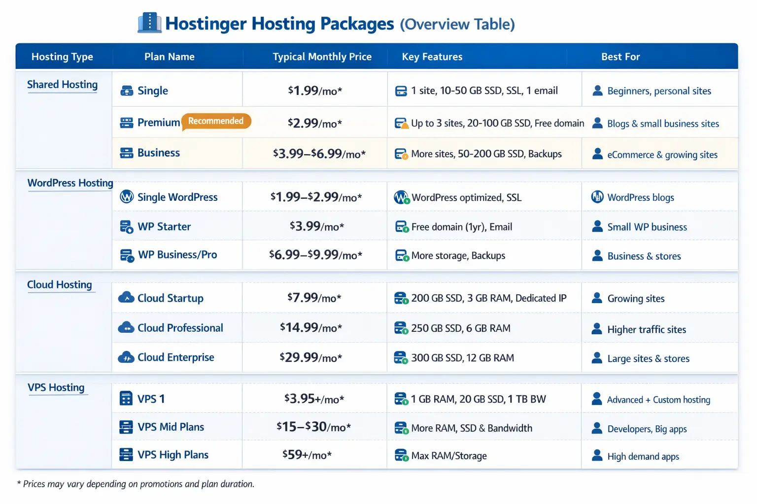 Hostinger offers a variety of hosting types suitable for beginners, bloggers, businesses, and developers. Here’s a quick overview: